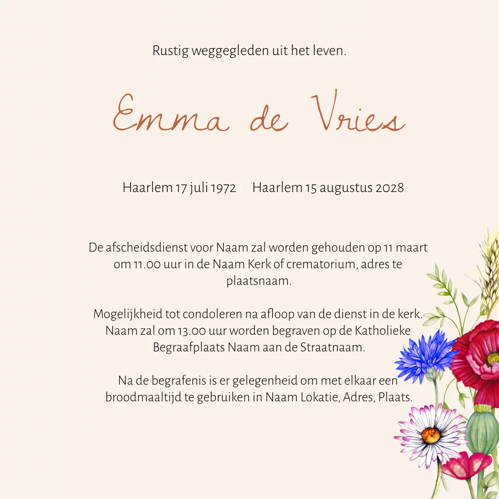 Mooie rouwkaart veldbloemen en vlinder