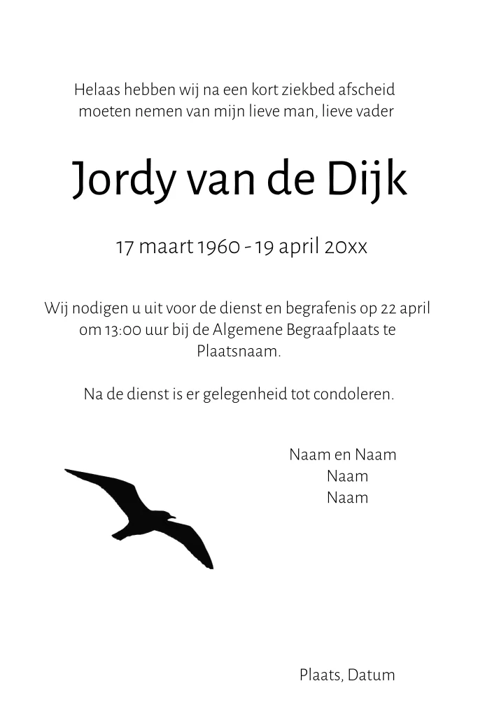 Rouwkaart met vogel / meeuw boven zee. Dit betreft een staande kaart, ook in vierkant en liggend formaat verkrijgbaar.