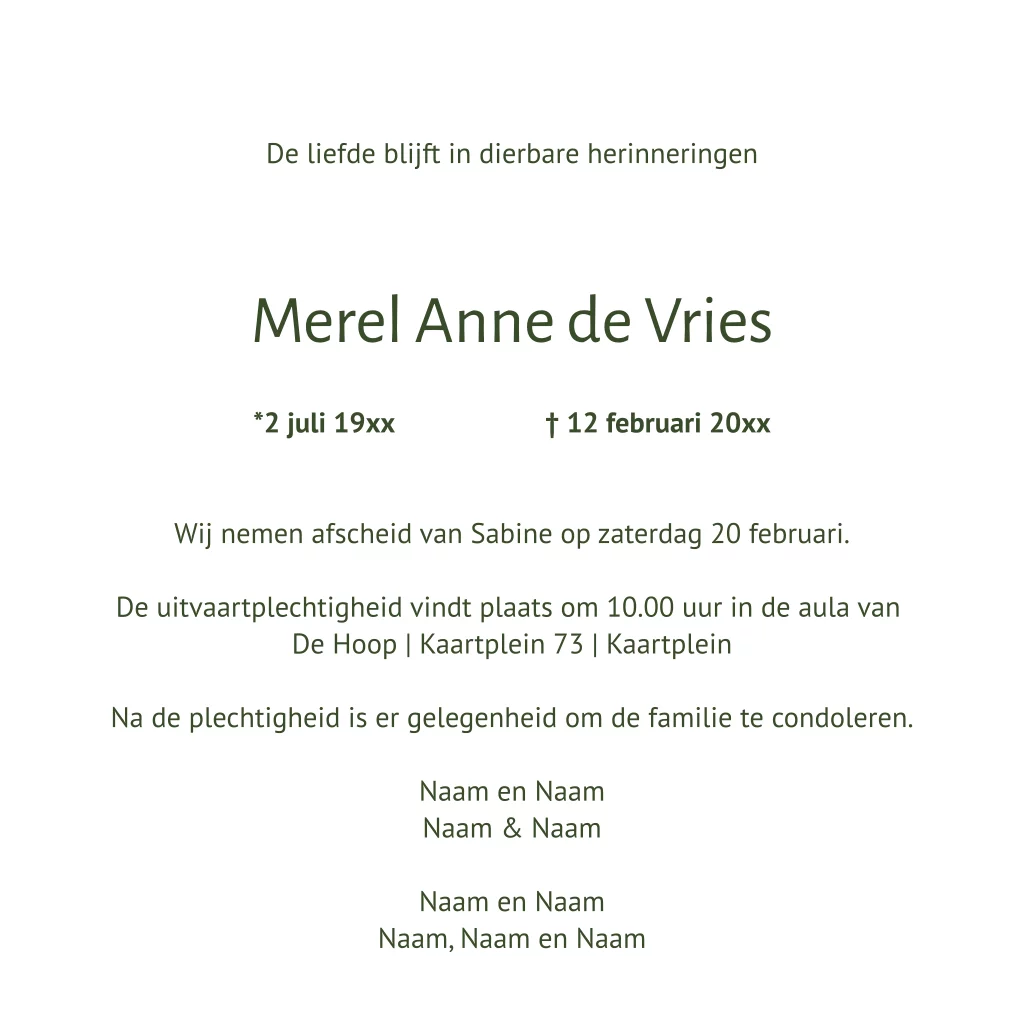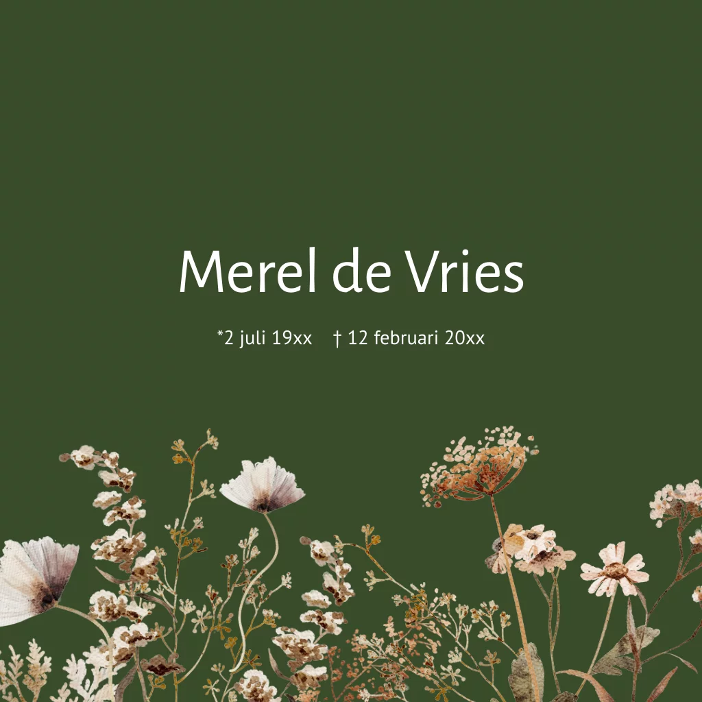 Groene moderne rouwkaart voor een vrouw met verschillende veld bloemen. (1088)