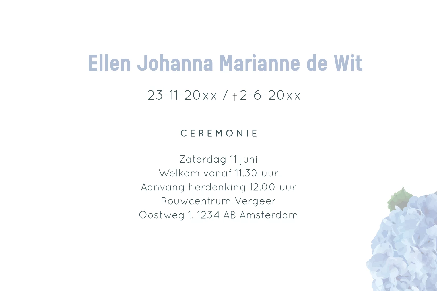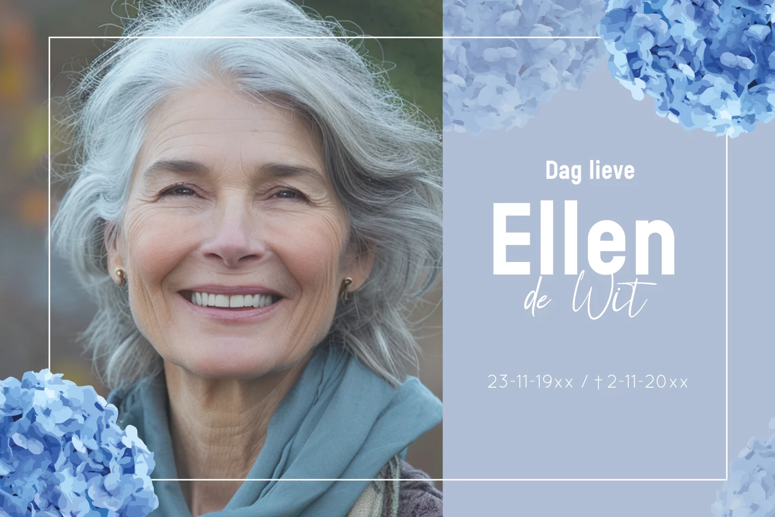 Rouwkaart vrouw blauwe hortensia en eigen foto