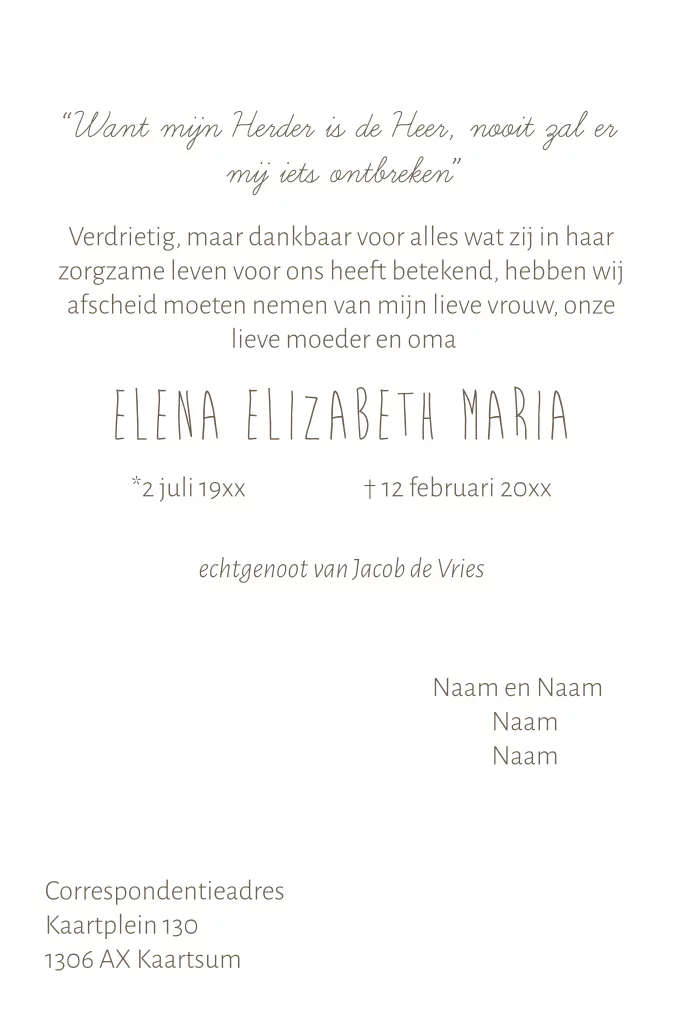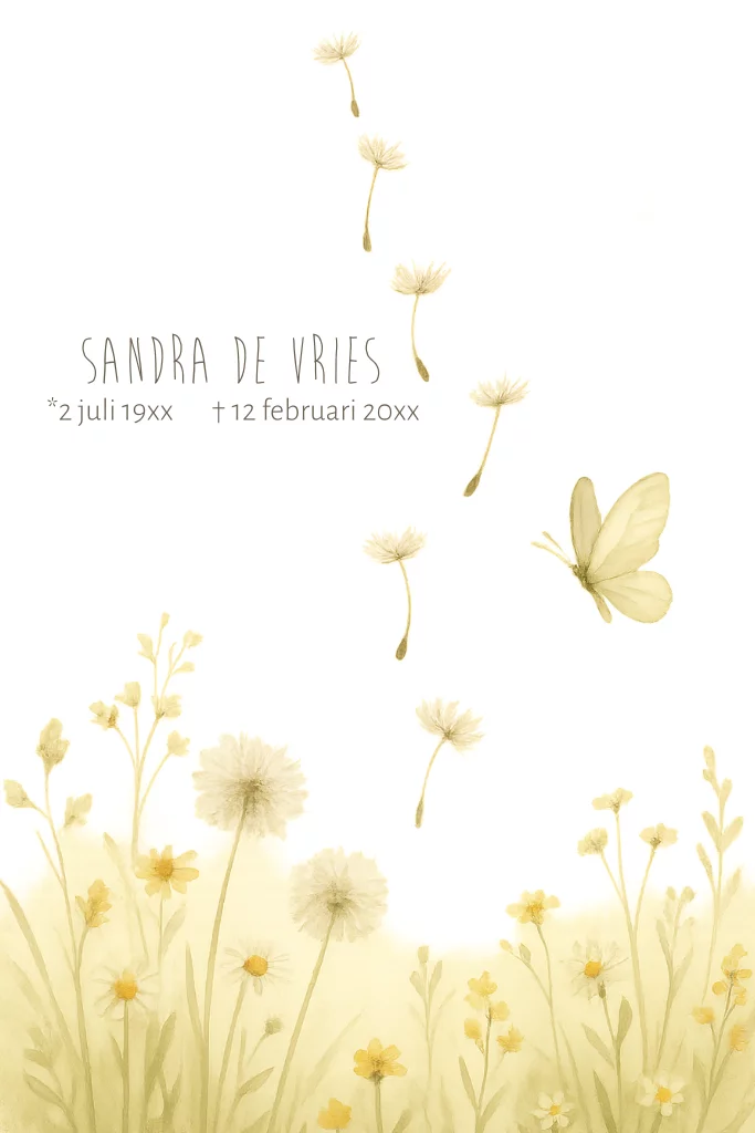 Rouwkaart voor een vrouw met een veld vol bloemen in neutrale kleuren. Een vlinder en paardenbloem pluisjes die weg vliegen. (999999)