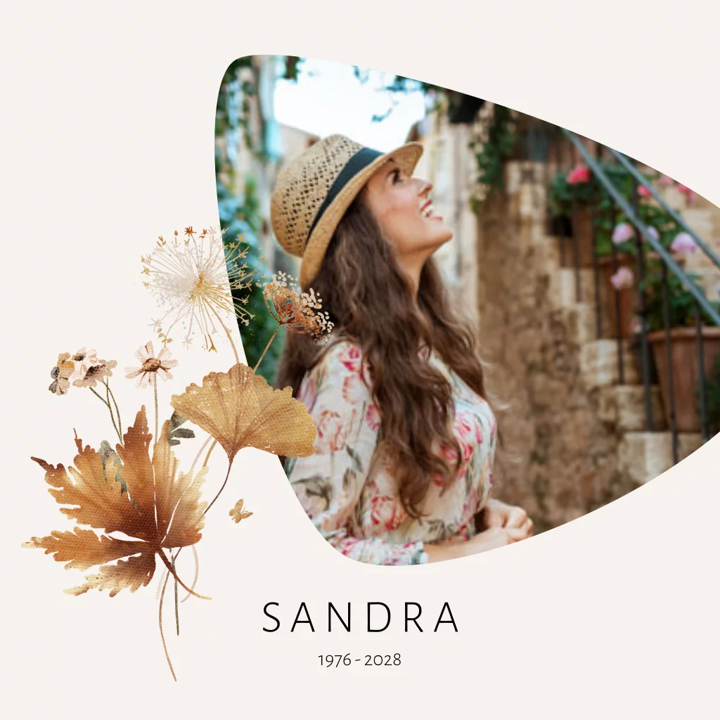 Moderne rouwkaart met droogbloemen en bladeren en paardenbloem. Voor een vrouw. Ruimte voor eigen foto. (957)
