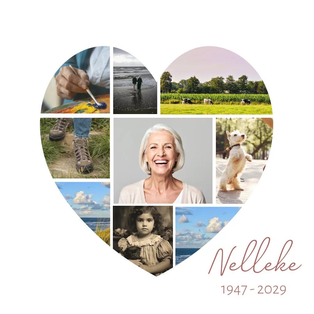 Rouwkaart voor een vrouw met een foto collage in de vorm van een hart. Alle foto's zijn naar wens aan te passen. (55555)