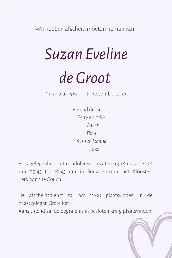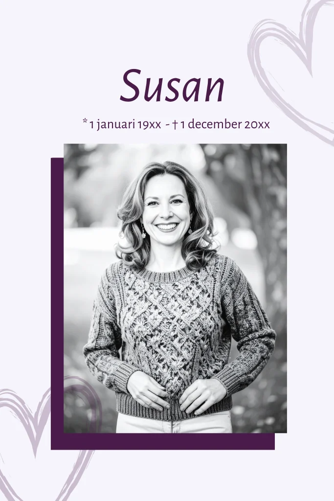 Rouwkaart voor een vrouw in paarse tinten met hartjes en ruimte voor het plaatsen van een eigen foto.