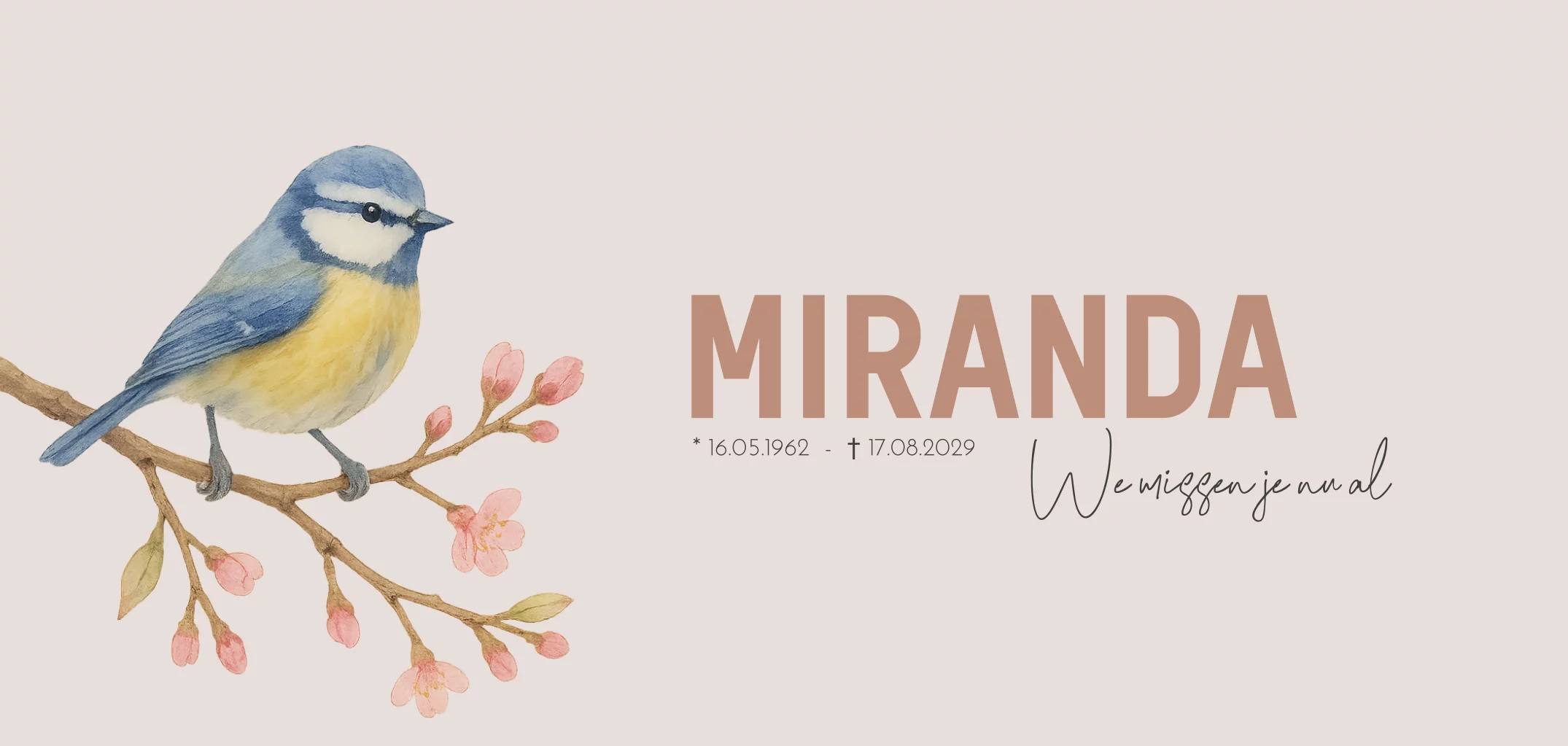 Panorama rouwkaart voor een vrouw met een vogel, koolmeesje op een tak met roze bloesem in aquarel. (979)