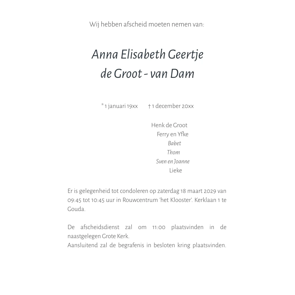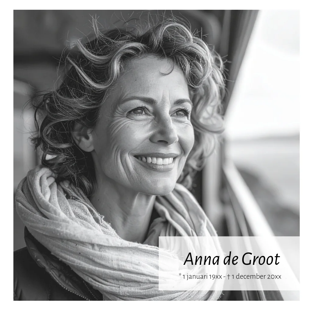 Minimalistische rouwkaart voor een vrouw met ruimt voor het plaatsen van een (zwart-wit) portret foto.