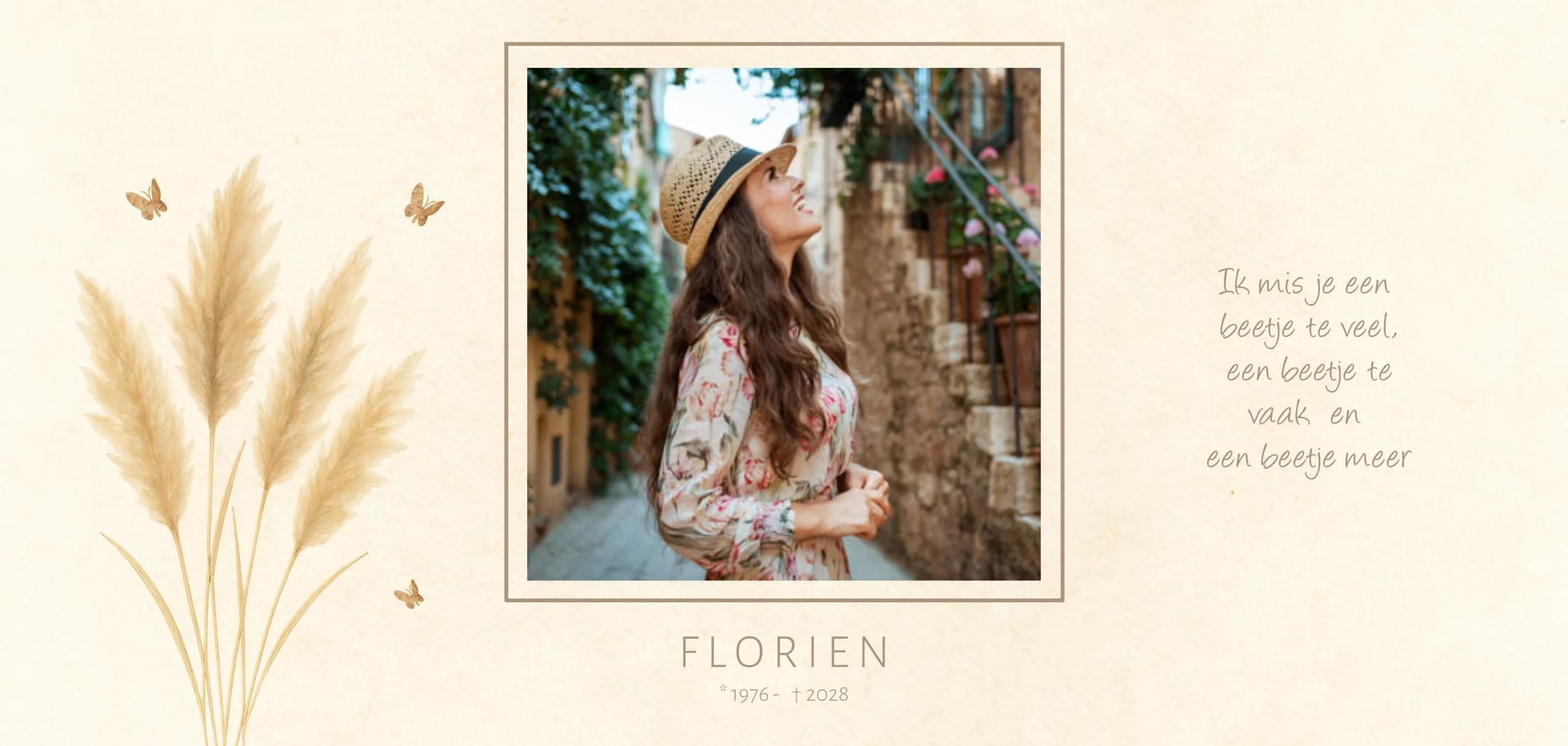 Moderne rouwkaart voor een vrouw in panorama formaat. Er is ruimte voor het plaatsen van een eigen foto. Vlinders en pampus gras in warme bruin tinten. (555555)