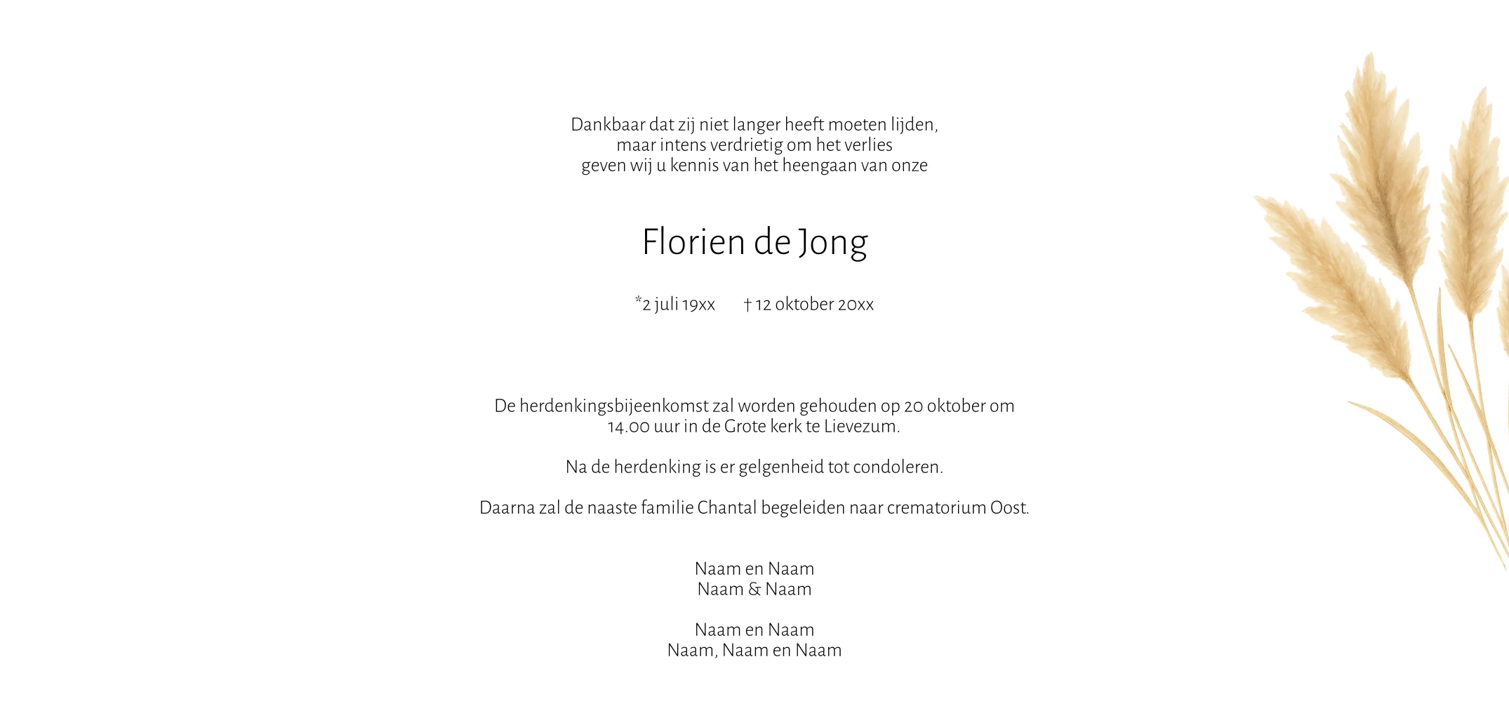Rouwkaart voor een vrouw modern met foto en pampus gras