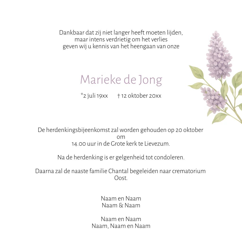Rouwkaart voor een vrouw met paarse seringen takjes en bloemen en vlinders. Er is ruimte voor het plaatsen van een eigen foto. (555555)