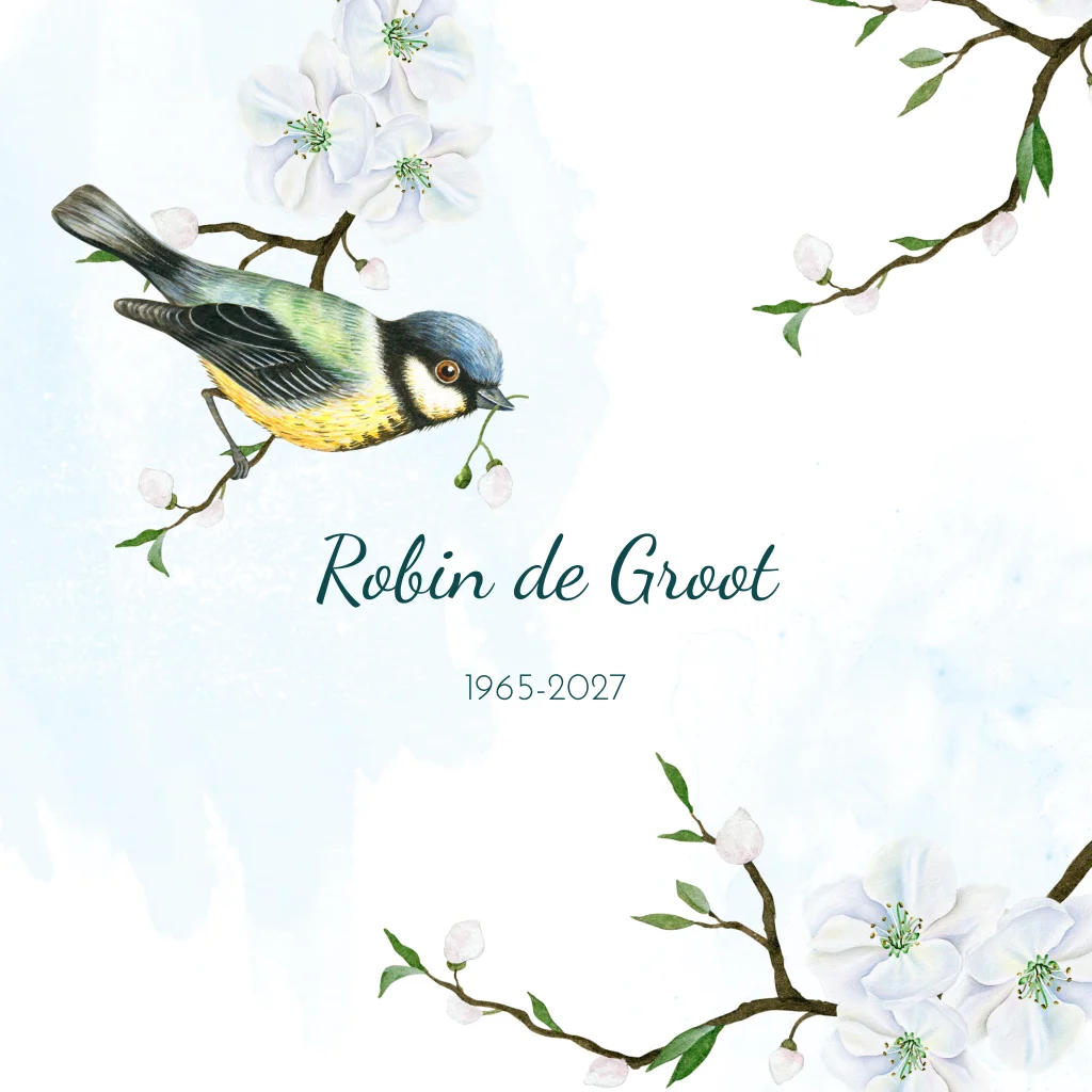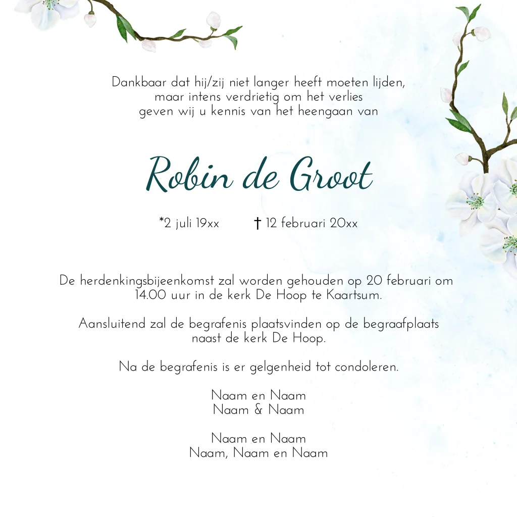 Rouwkaart takjes bloesem en koolmees vogel