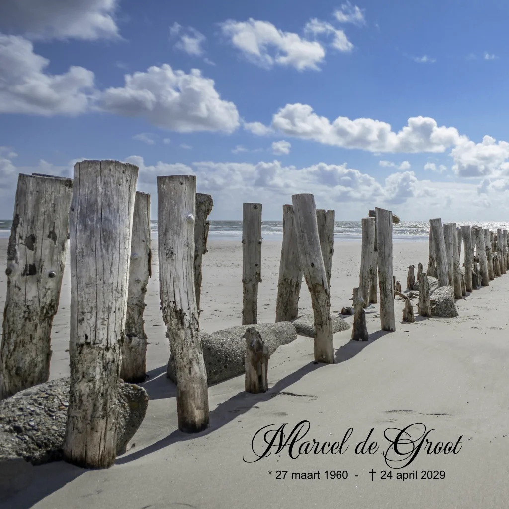 Rouwkaart met zee strand blauwe lucht en strandpalen