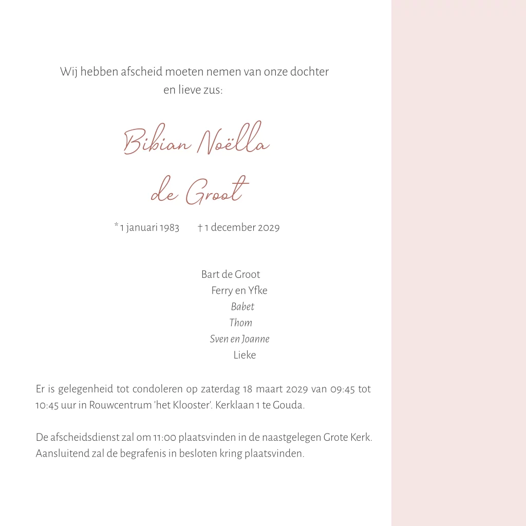 Rouwkaart modern voor en vrouw warme roze kleur met foto