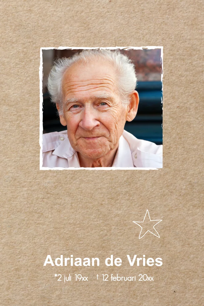 Rouwkaart staand met kraft kleurige achtergrond. Met speelse stoer foto kader in het midden en open ster. Alles op deze kaart staat los. (398)