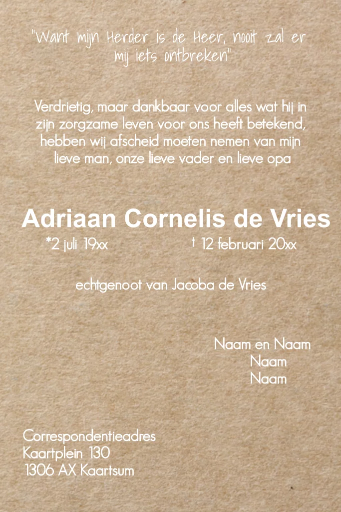 Rouwkaart voor een man met kraft look achtergrond en een eigen foto