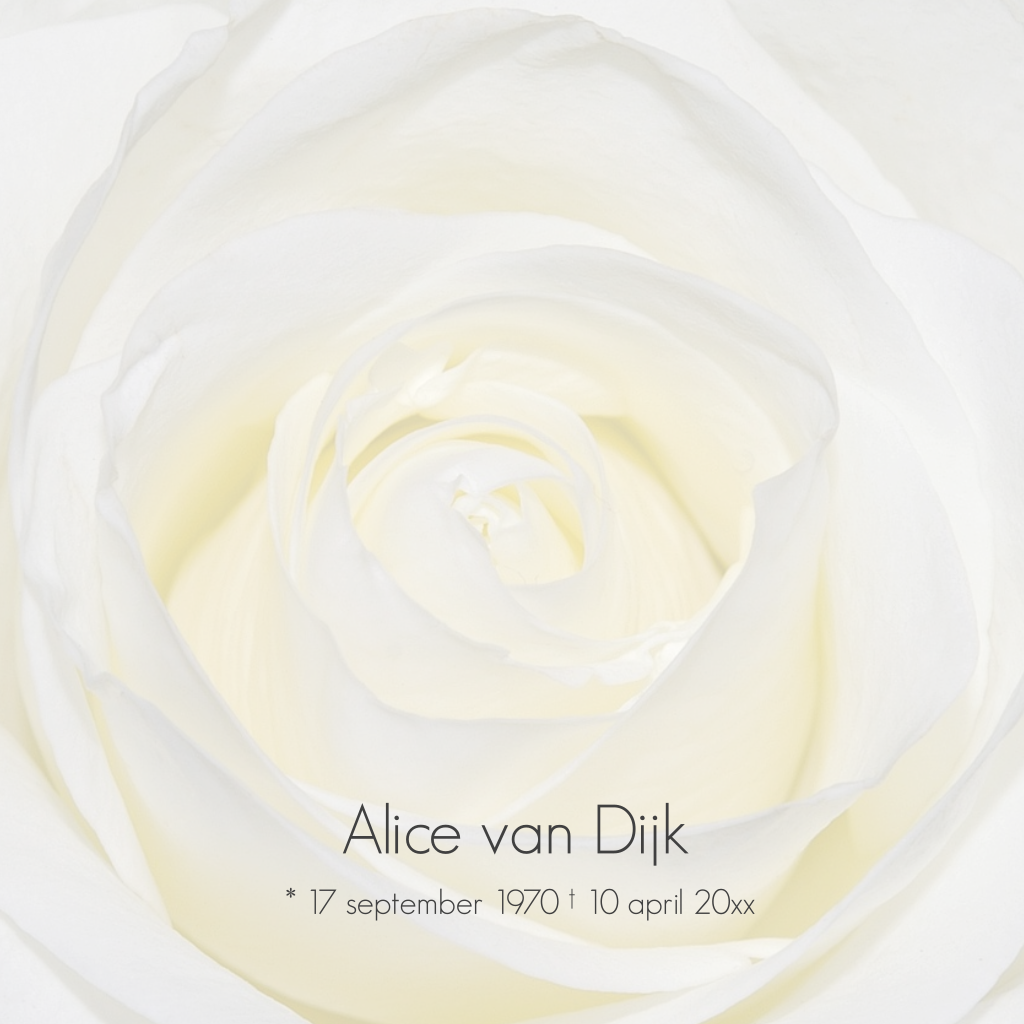 Rouwkaart voor een vrouw met witte roos en grijze tekst