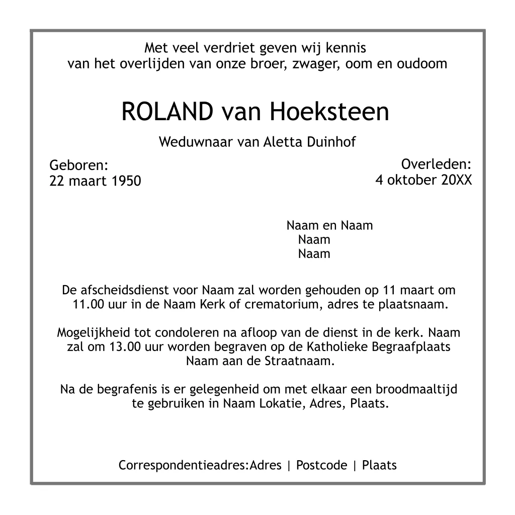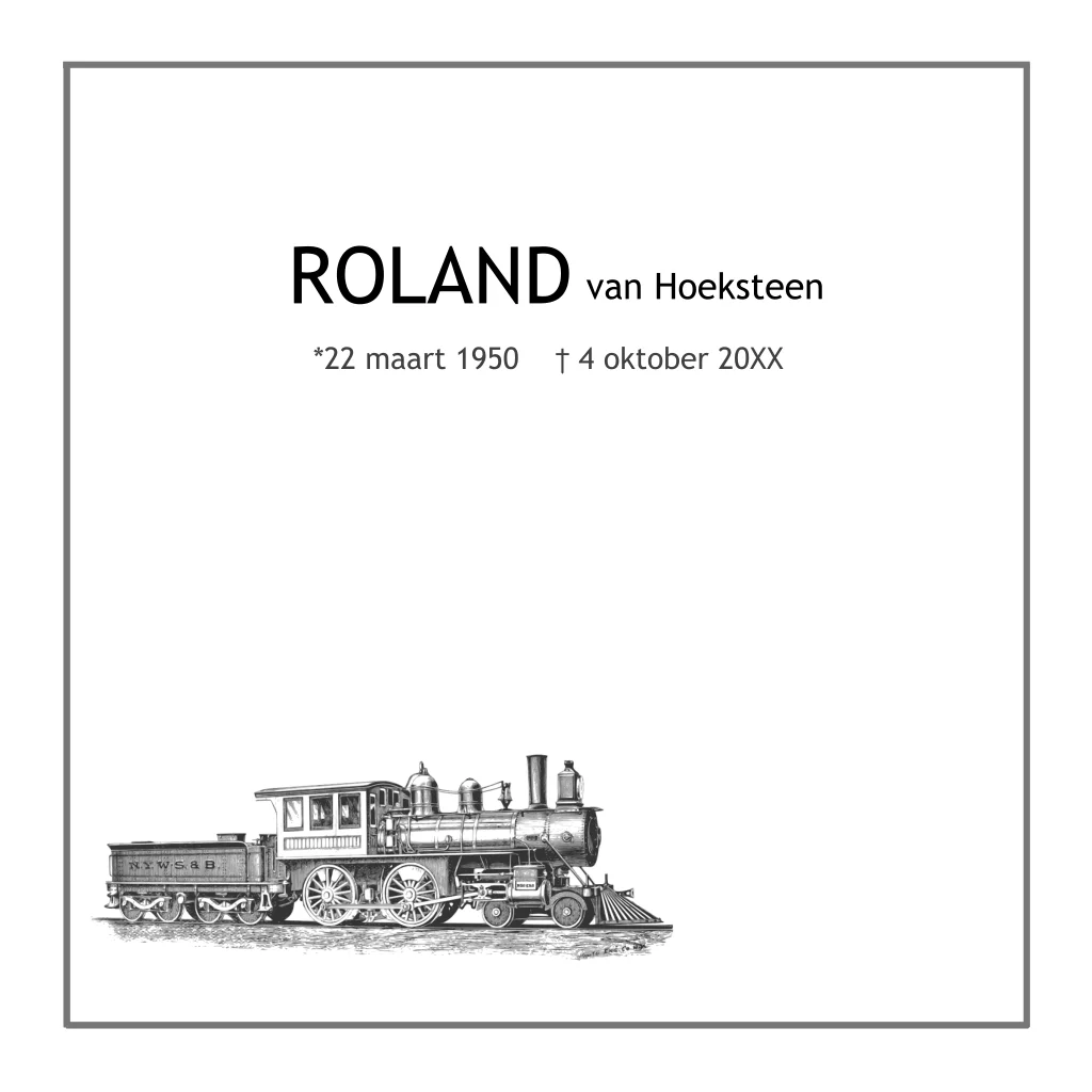Traditionele rouwkaart maken met zwarte rouwrand met een stoom locomotief. Plaats eventueel een eigen foto van een trein treinen. Alle teksten en kleuren zijn naar keuze aan te passen en het rouwkader is ook te verwijderen (39)