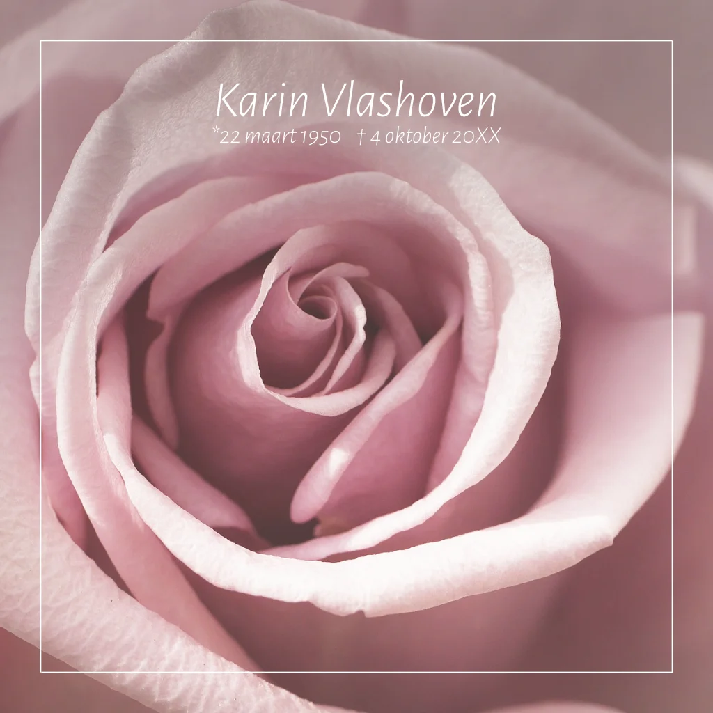 Rouwkaart vrouw witte roze roos en rouwrand. Alle teksten en kleuren zijn naar keuze aan te passen. (25)