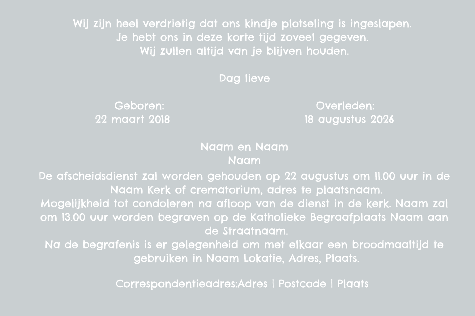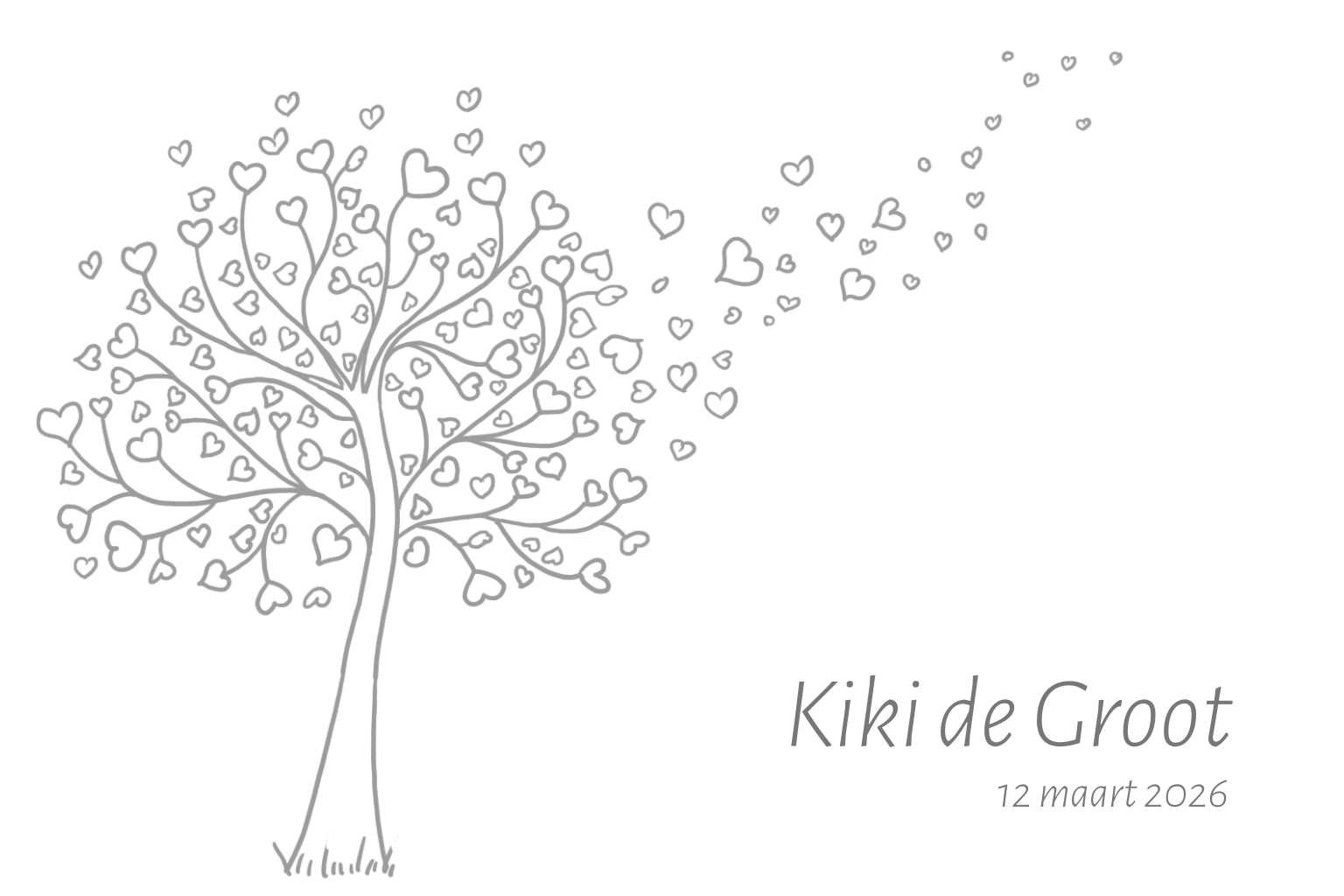 Mooi rouwkaartje voor een overleden baby of kindje met getekende boom met hartjes in grijstonen. (350)