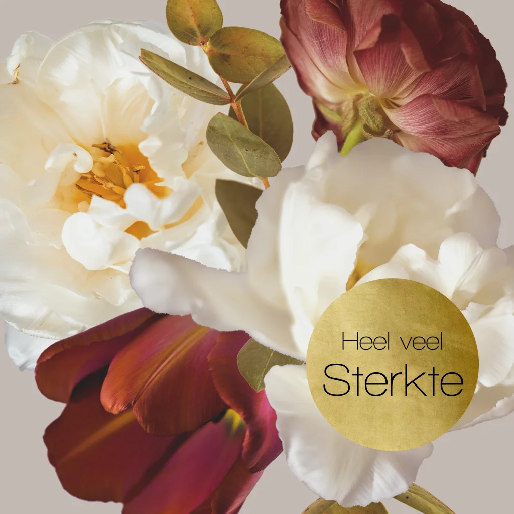 Stijlvolle wenskaart met beige en donkerrode bloemen. En goudlook details voor, binnen en achterzijde. (838)