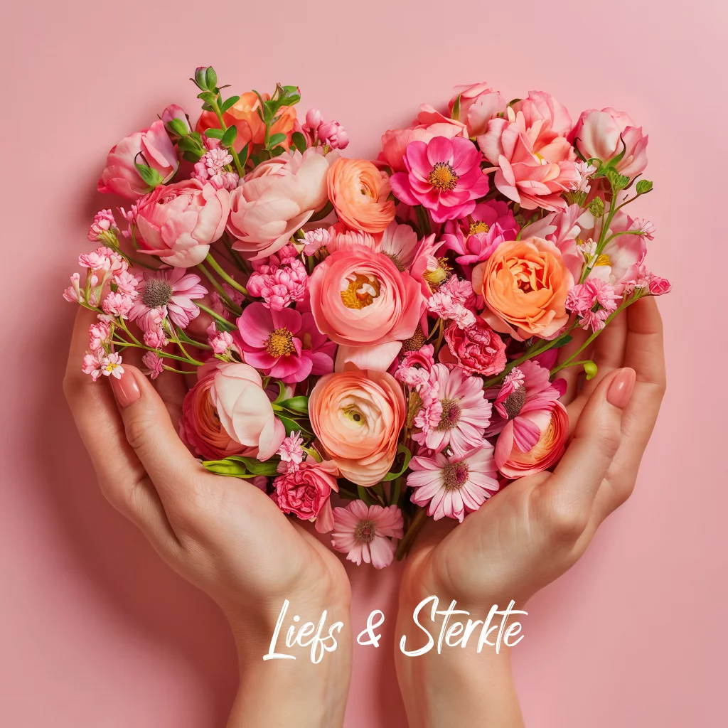 Een mooie en lieve condoleancekaart met 2 handen die een bloemenhart dragen. (1139)