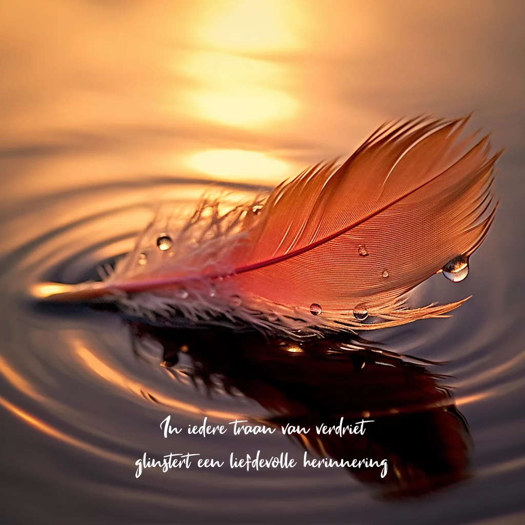 Mooie condoleancekaart met watercirkels, een veer, druppels en een zonsondergang. (1014)
