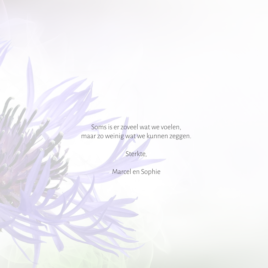 Fotografie condoleance kaart met paarse bloem. Alle teksten zijn naar keuze aan te passen.