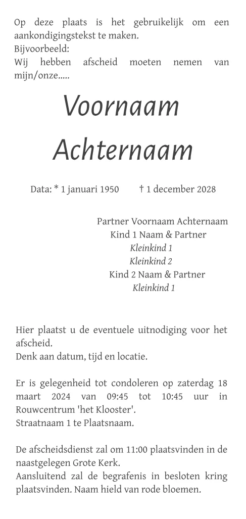 Zelf een staande langwerpige rouwkaart ontwerpen? Start met dit lege ontwerp in onze kaartenmaker of upload hier een eigen ontwerp.